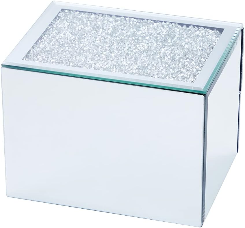 - Pure mirror glass on every surface — no texture, no pattern, just reflection — Unlike the crushed diamond variant, this version is finished in seamless pure mirror glass from every angle. The result is a cleaner, more understated look that reflects the room around it rather than drawing attention to itself — a vanity piece that elevates the space without competing with it.