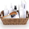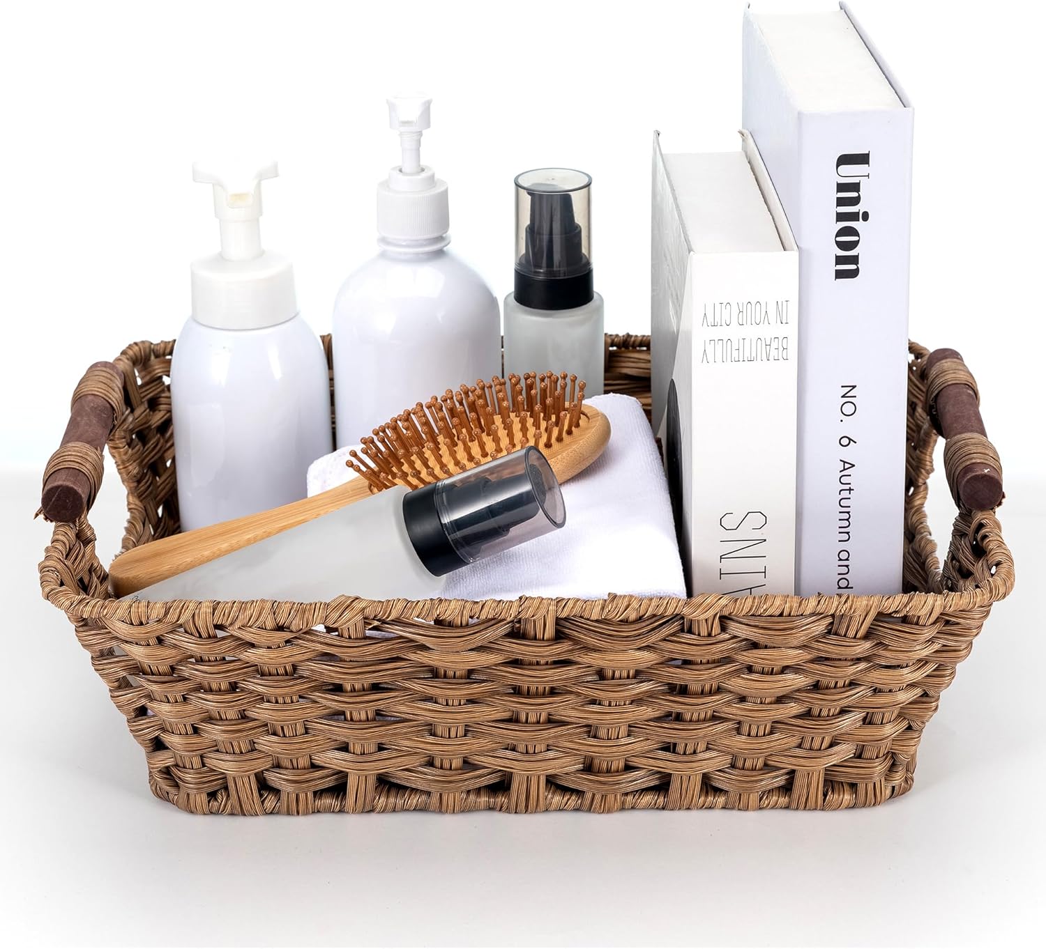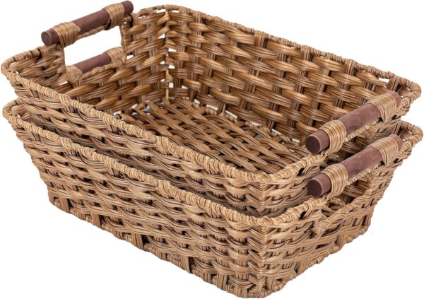 - Waterproof wicker that handles the rooms real baskets have to survive — The plastic wicker weave is fully waterproof — wipe it down, rinse it out, use it in a bathroom, under a sink, in the pantry, or near the laundry without any concern about moisture warping or softening the material. It stays clean, dry, and shape-retaining through the kind of use most natural fiber baskets can’t handle.