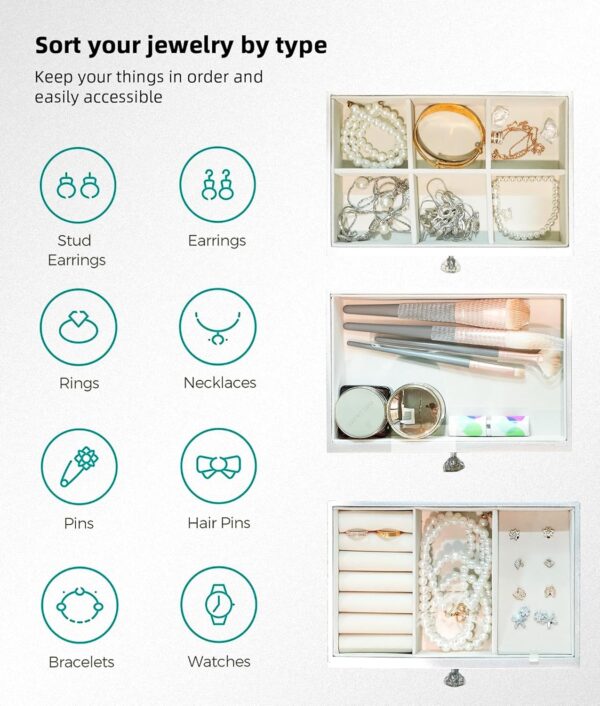 - Three layers, three different storage functions in one box — The first drawer holds rings, earrings, pendants, and small pieces across four organized compartments. The second tier offers six removable slots sized for bracelets, necklaces, and pendants. The third open-format drawer handles oversized pieces — watches, glasses, hairpins, and anything else that doesn’t fit neatly into fixed compartments. Every jewelry type has its own dedicated space.