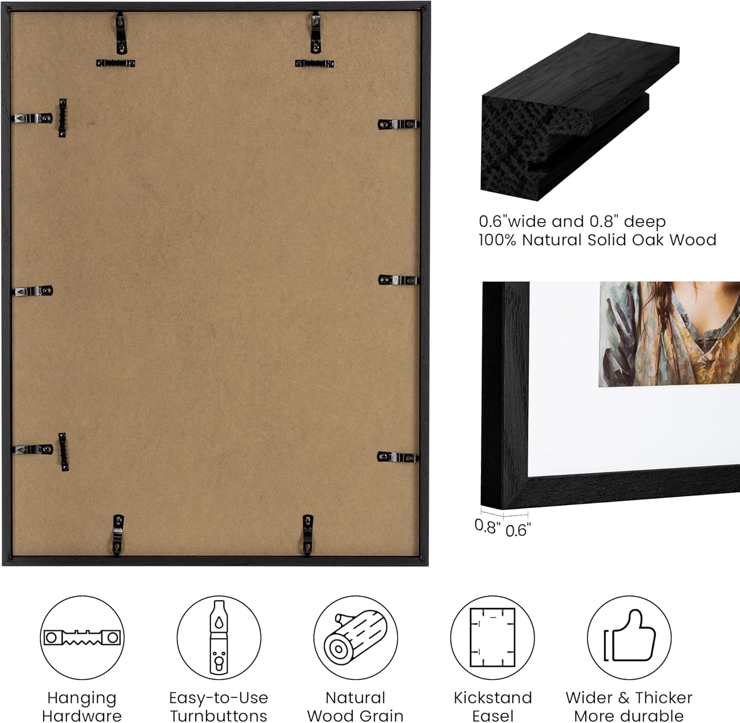- Real solid oak with grain you can actually see — These frames are constructed from premium solid oak wood — not MDF, not wood composite, not wood-grain paper wrapped over particleboard. The natural grain pattern runs through every frame, giving each one its own subtle character while maintaining the warm, consistent tone that makes a three-pack hang together as a cohesive set.