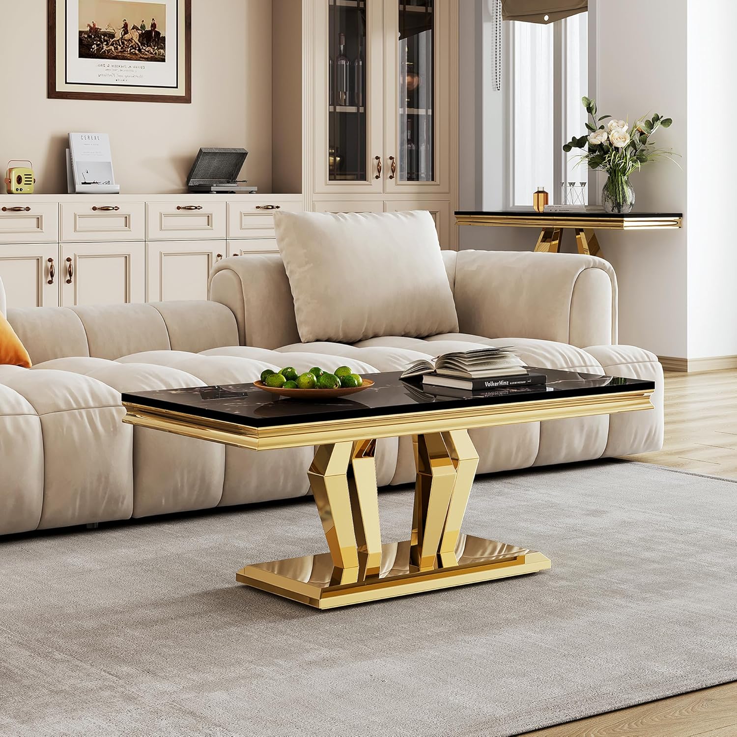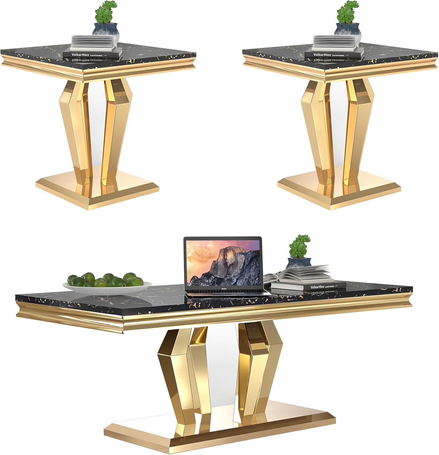 3 Piece Coffee Table Set Black Gold Marble Living Room Tables