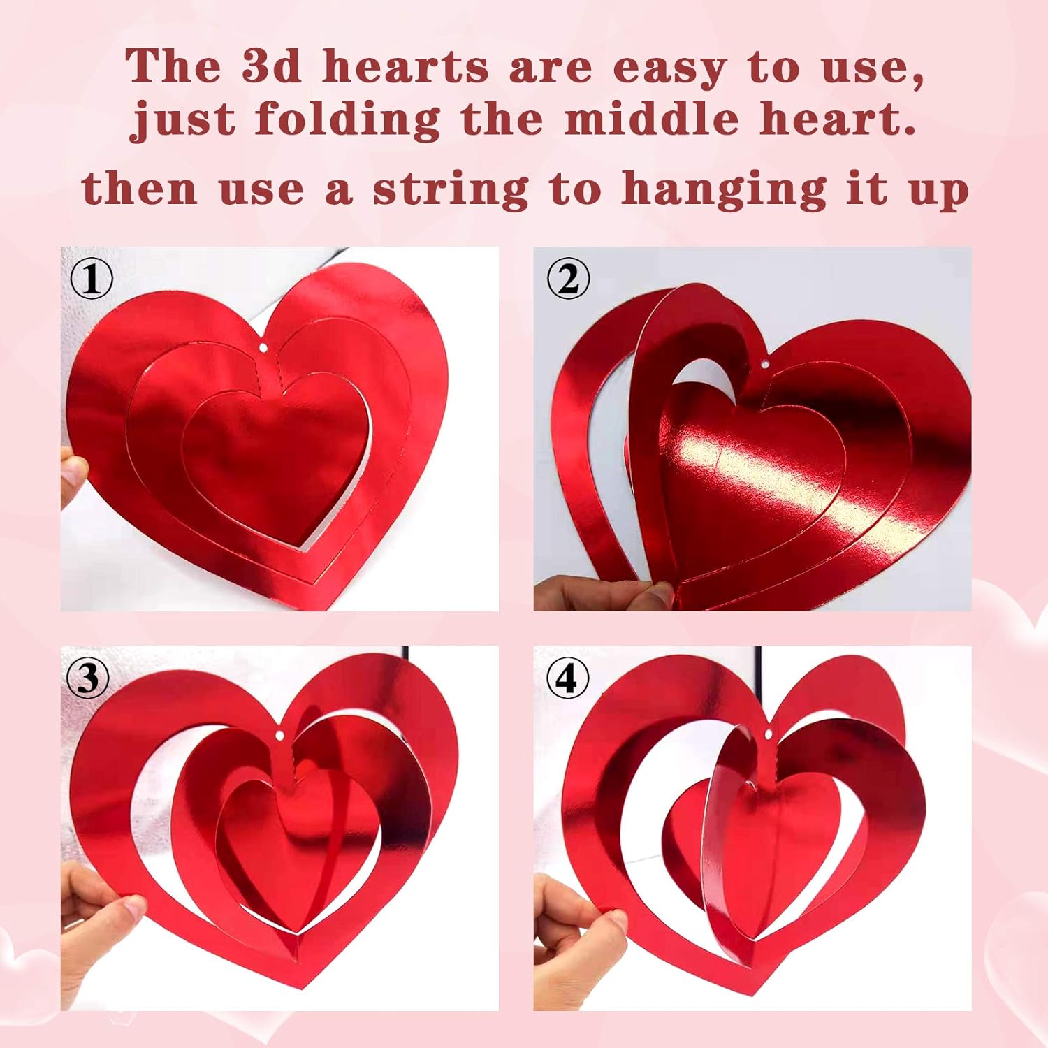 - Fold-and-string assembly that takes under ten minutes — Fold each heart along its center crease, thread the included strings through, and hang. The whole setup is genuinely quick — no tools, no complicated instructions, no parts to figure out. Fifteen strings come included so every piece in the pack is ready to hang without sourcing additional materials.