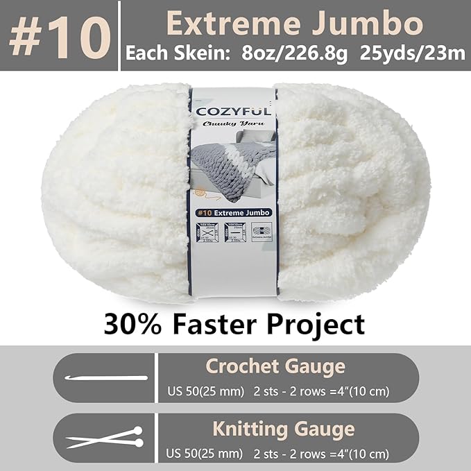 • #10 Extreme Jumbo Yarn: #10 thick yarn has a thickness of 1 inch/25 mm, each skein weighing 8 oz/226.8 g and a length of 25 yds/23 m. Each skein of chunky knit yarn features a consistent thickness, ensuring a uniform texture for your knitted chunky yarn blankets. The thicker big yarn results in denser blankets with greater coverage, enabling a 30% faster knitting speed and a 30% increase in warmth compared to #8 chenille chunky yarn.