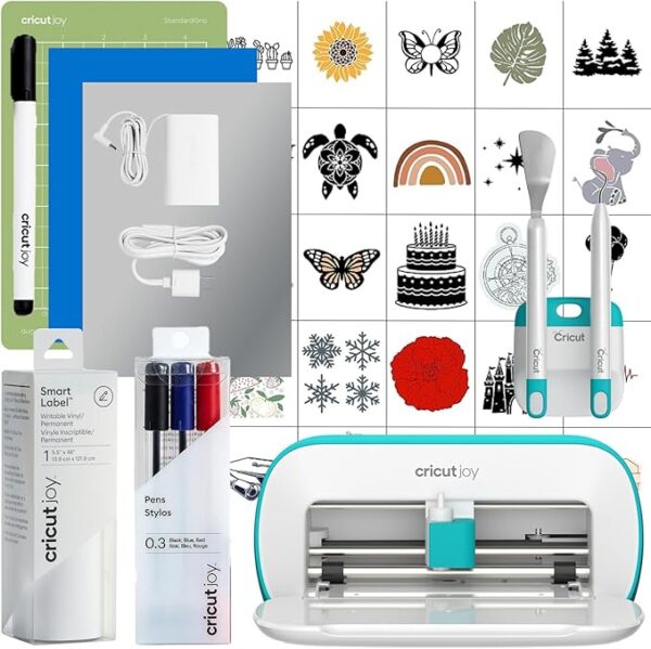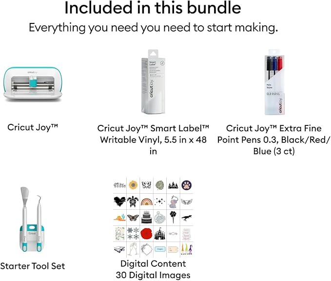 • BUNDLE INCLUDES – Cricut Joy Smart Cutting Machine, Card Machine Mat, 1 roll of Smart Label Writable Vinyl, Fine Point Pen Set, 3-piece tool kit, & 30 images of digital content