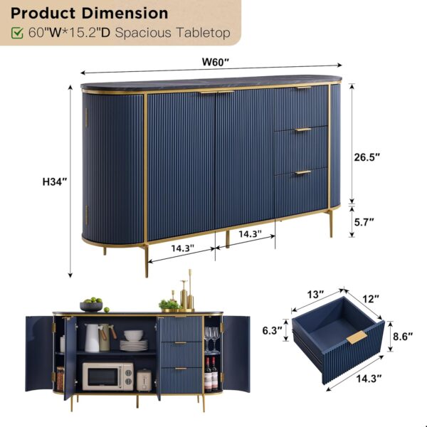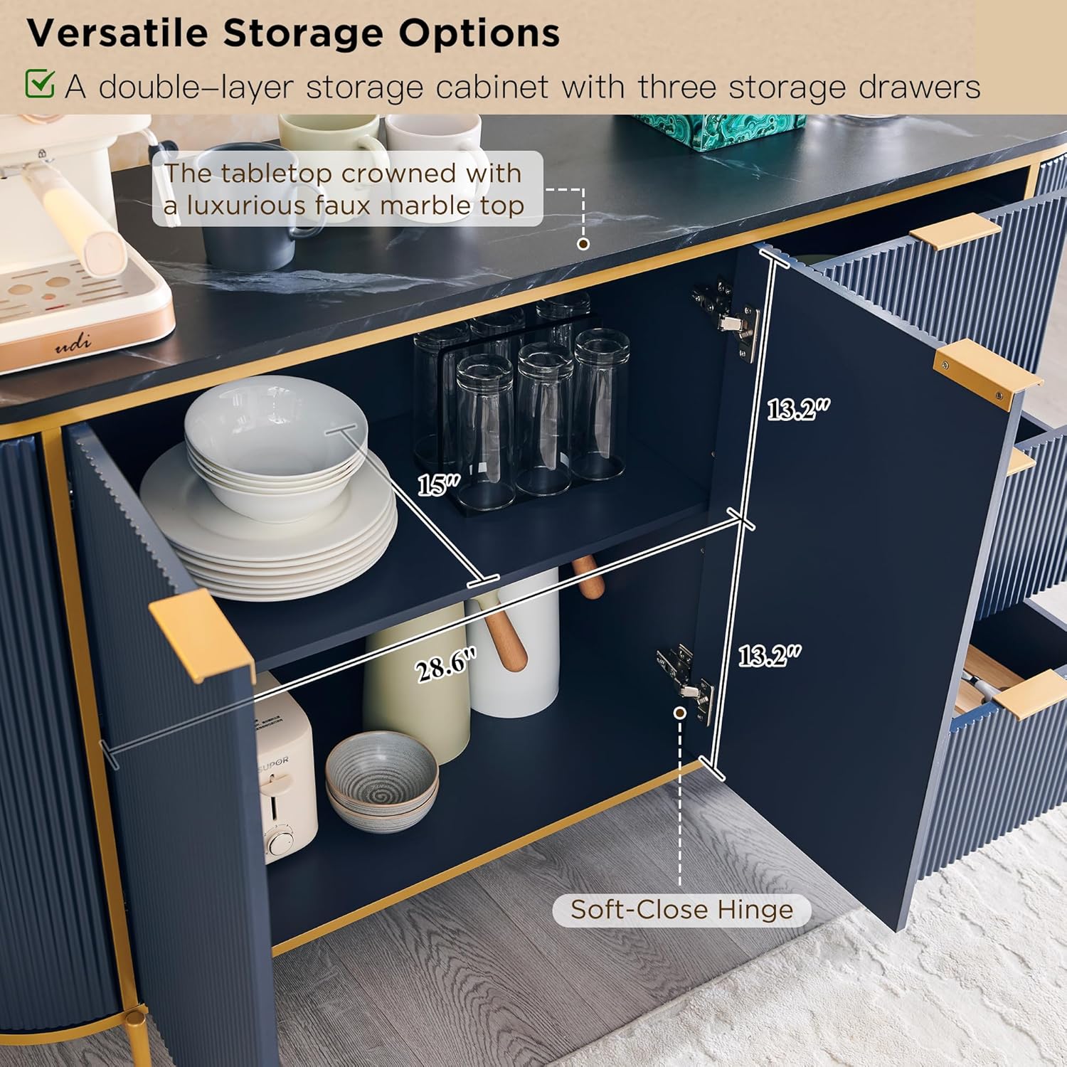 - Offers ample storage with cabinets and drawers, ideal for organizing tableware, wine, coffee items, and daily essentials.