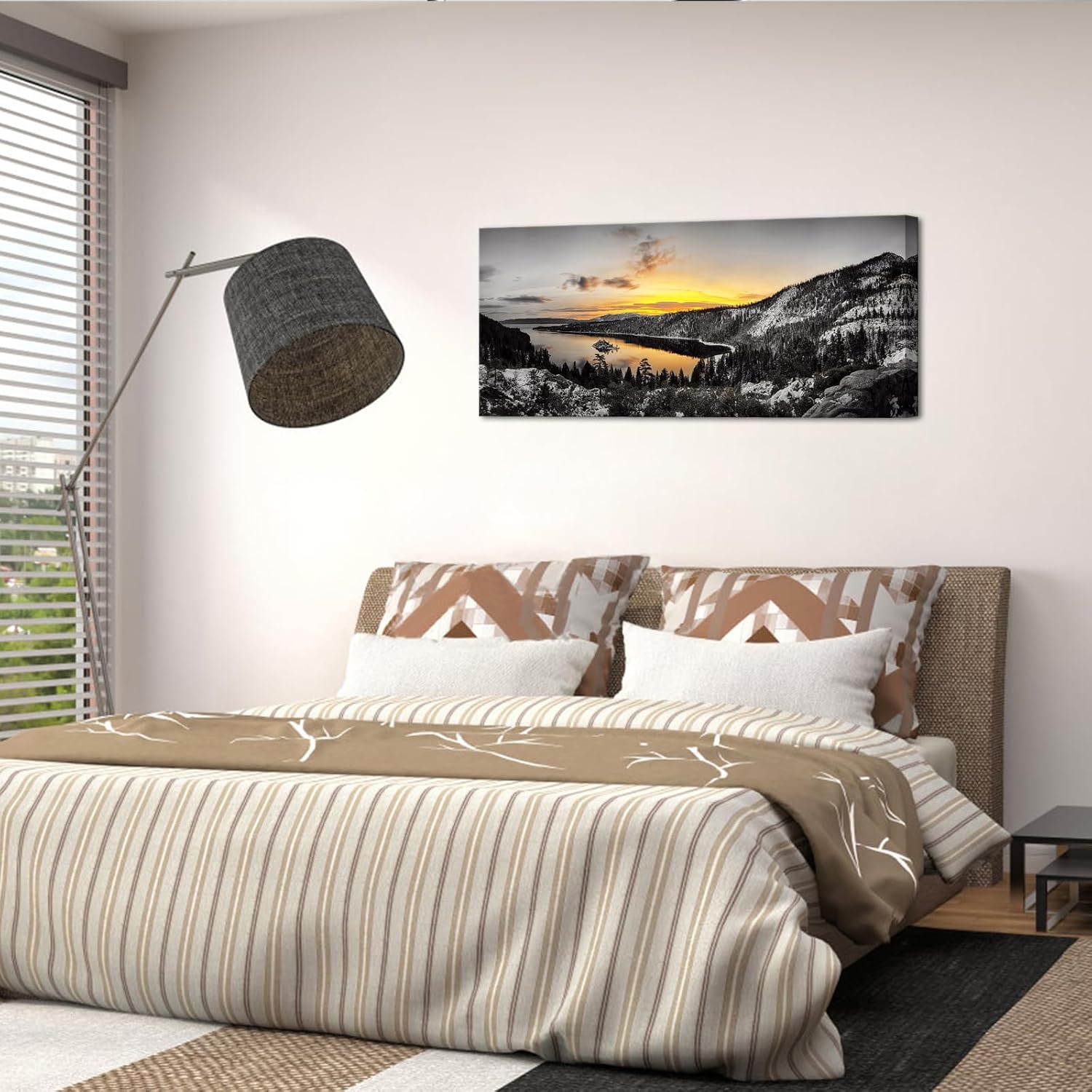 • Features a stunning panoramic view of a scenic lake at sunrise, bringing a calm and natural atmosphere to your space.