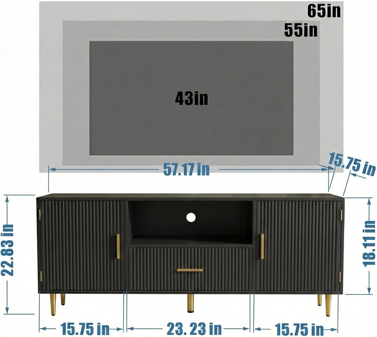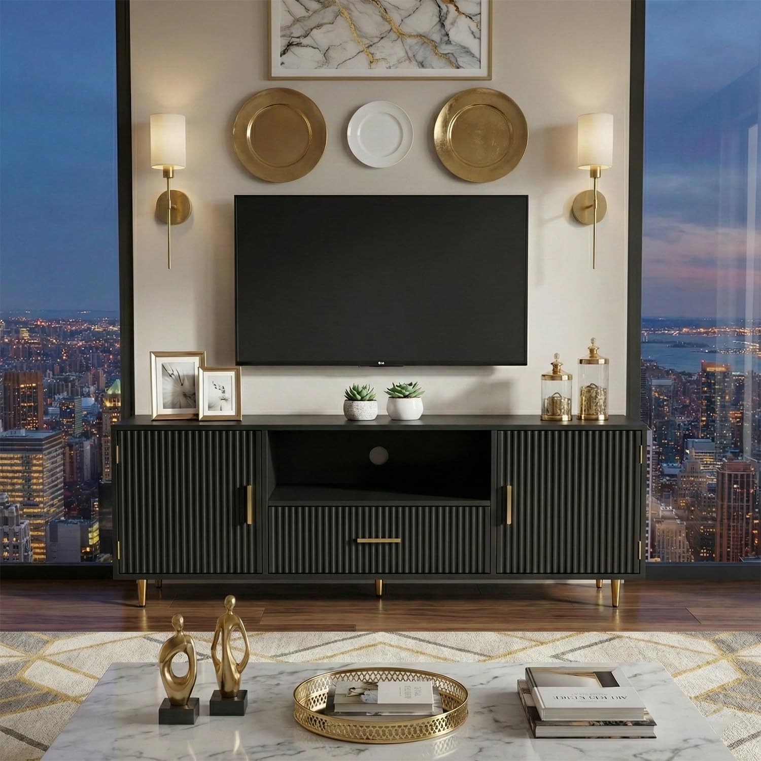 Modern Fluted TV Stand 57 Inch Media Console Cabinet Black