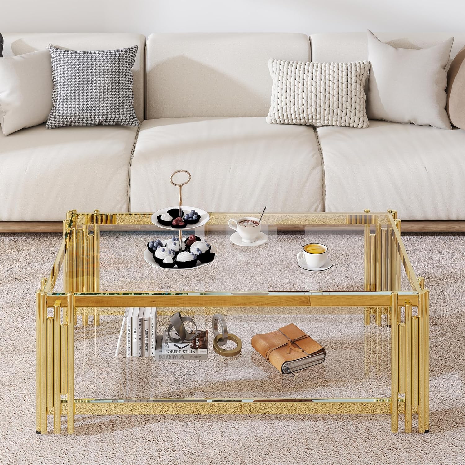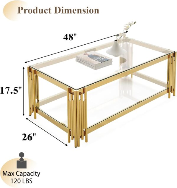 • Features a modern design with a clear tempered glass top and gold metal frame, adding a sleek and elegant touch to any living space.