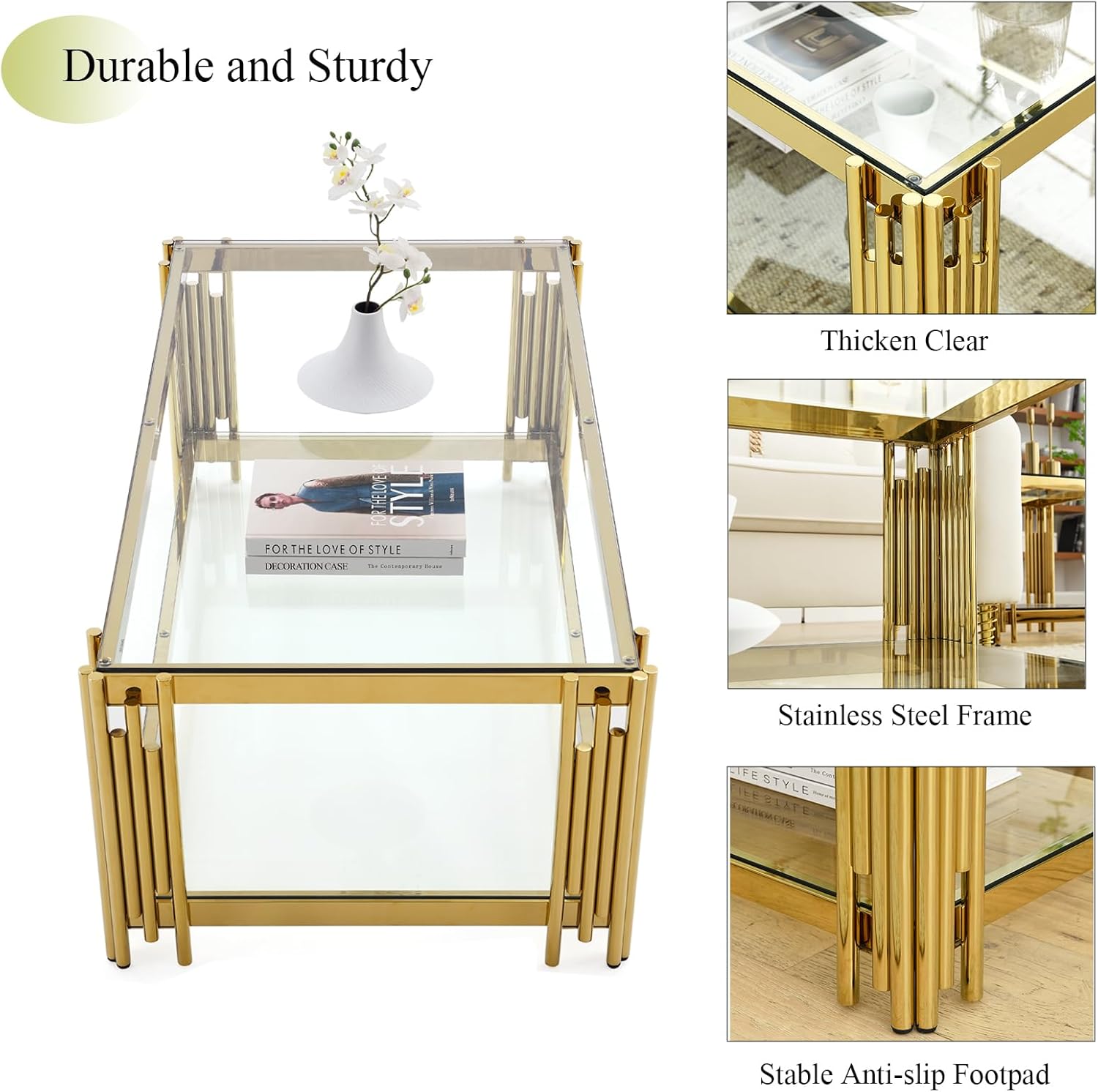 Modern Glass Coffee Table Two Tier with Gold Stainless Steel Base