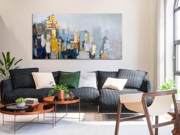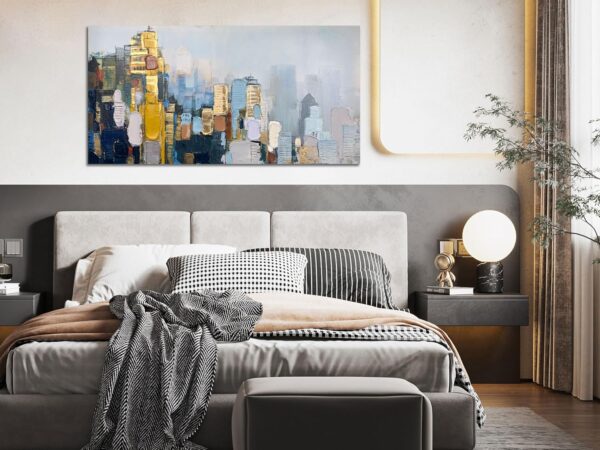 • Large framed canvas artwork with a textured skyline design, adding depth and visual appeal to any space.