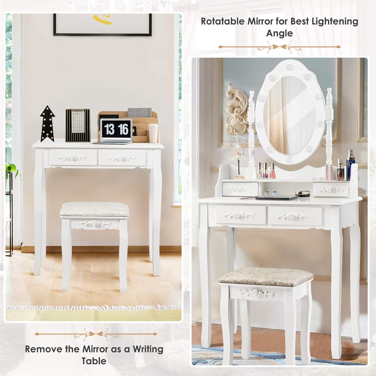 • Versatile design allows the mirror section to be removed, transforming the table into a functional desk for writing or study.