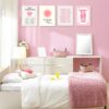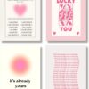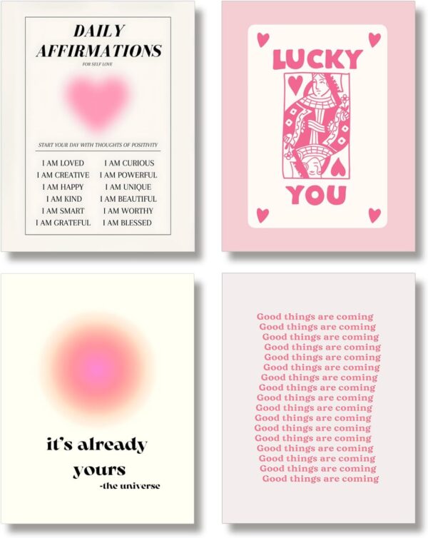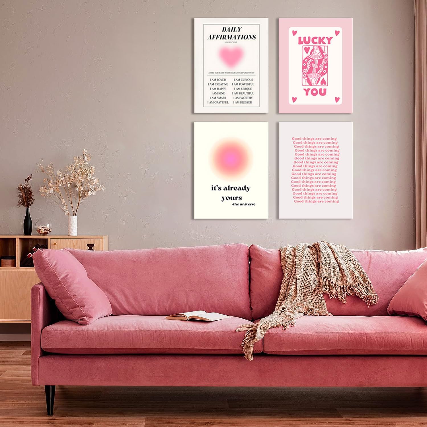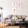 - Features a set of four framed prints with bold pink tones and retro-inspired aesthetic for a trendy look.