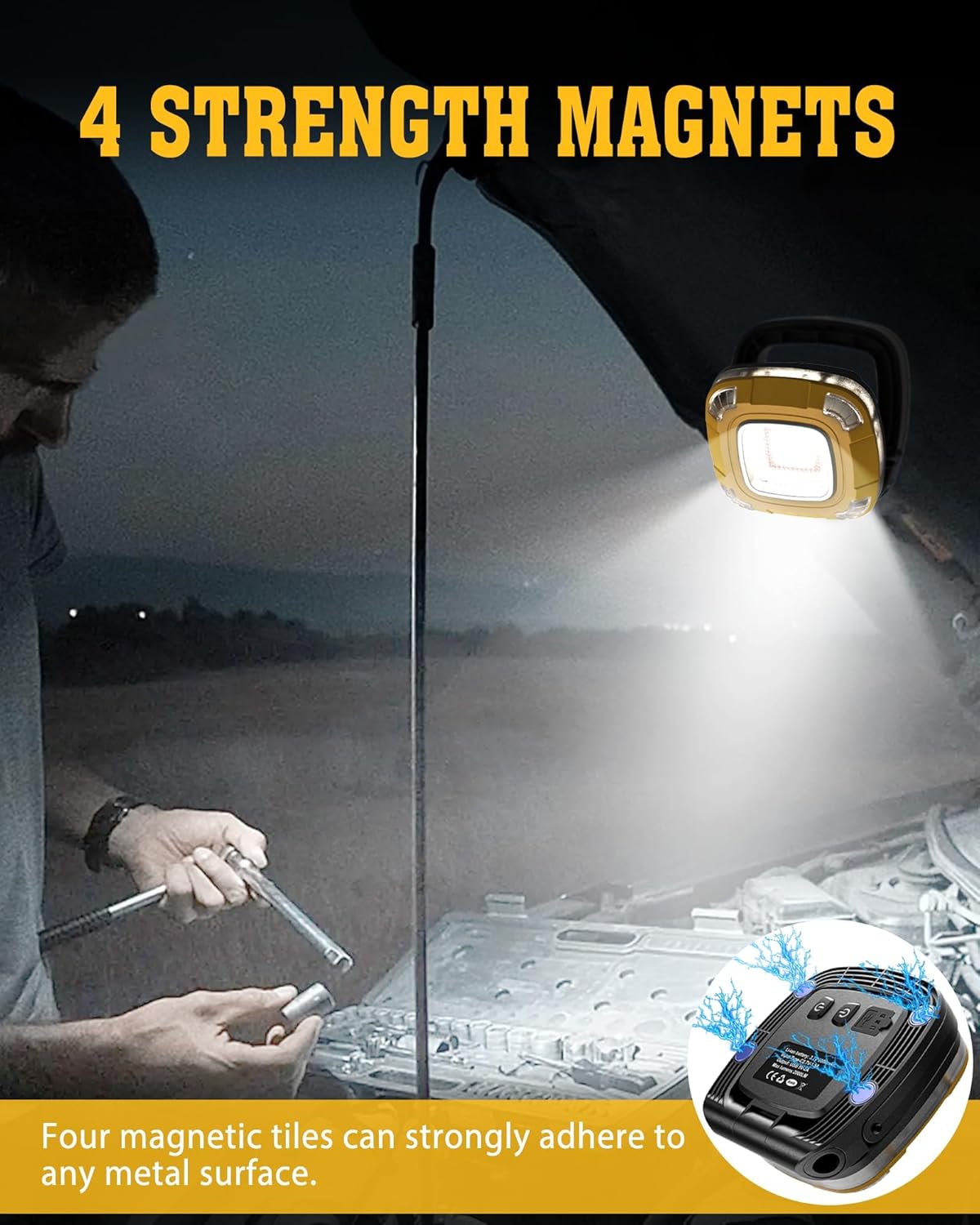 - A full-charge power bank built into a work light — This lantern doesn’t just illuminate — it charges devices. The built-in power bank function lets you charge a phone, tablet, or other USB device directly from the lantern during a power outage, camping trip, or roadside emergency. One tool, two critical functions, always in the same place when you need both.