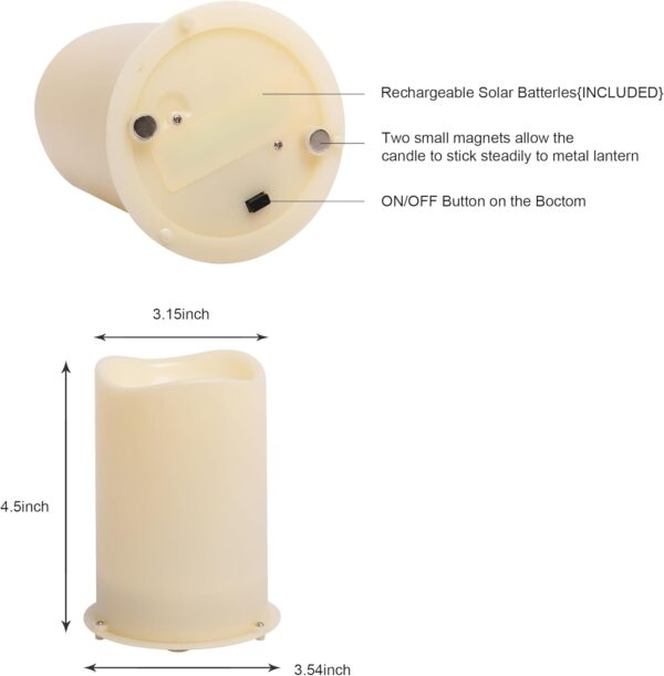 - Magnet-base solar candles that use and remove easily — The solar candles magnetically attach to the lantern base, which means pulling them out to charge, repositioning them, or replacing them with LED alternatives takes seconds. The magnet also holds the candle steady on any iron surface independently — which opens up additional placement options beyond the lantern itself.