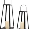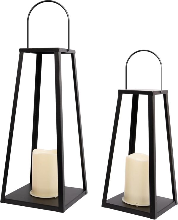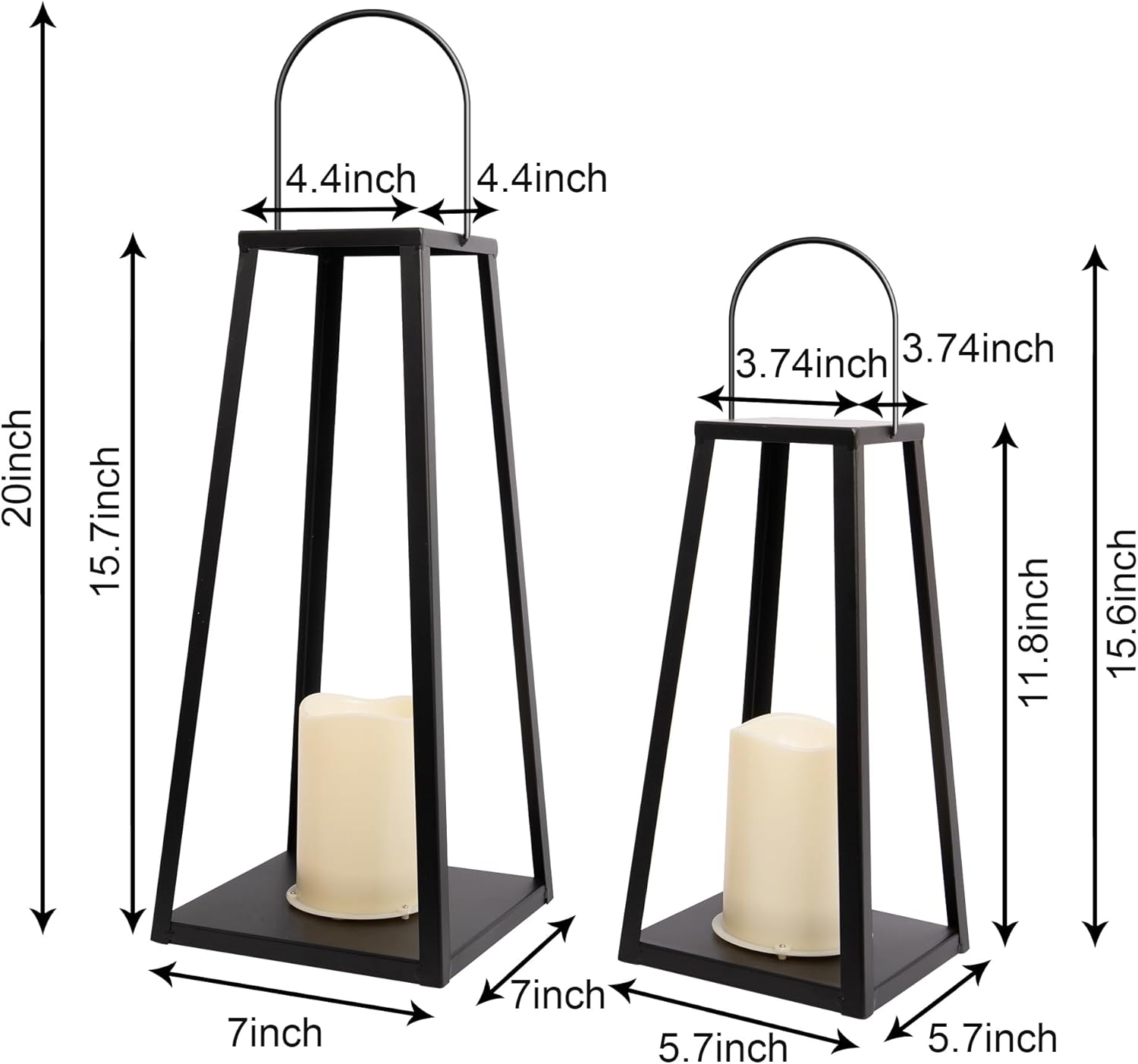 Set of 2 Black Metal Solar Farmhouse Lanterns — 20″ and 15.6″ with Waterproof Solar Candles, Hang or Tabletop