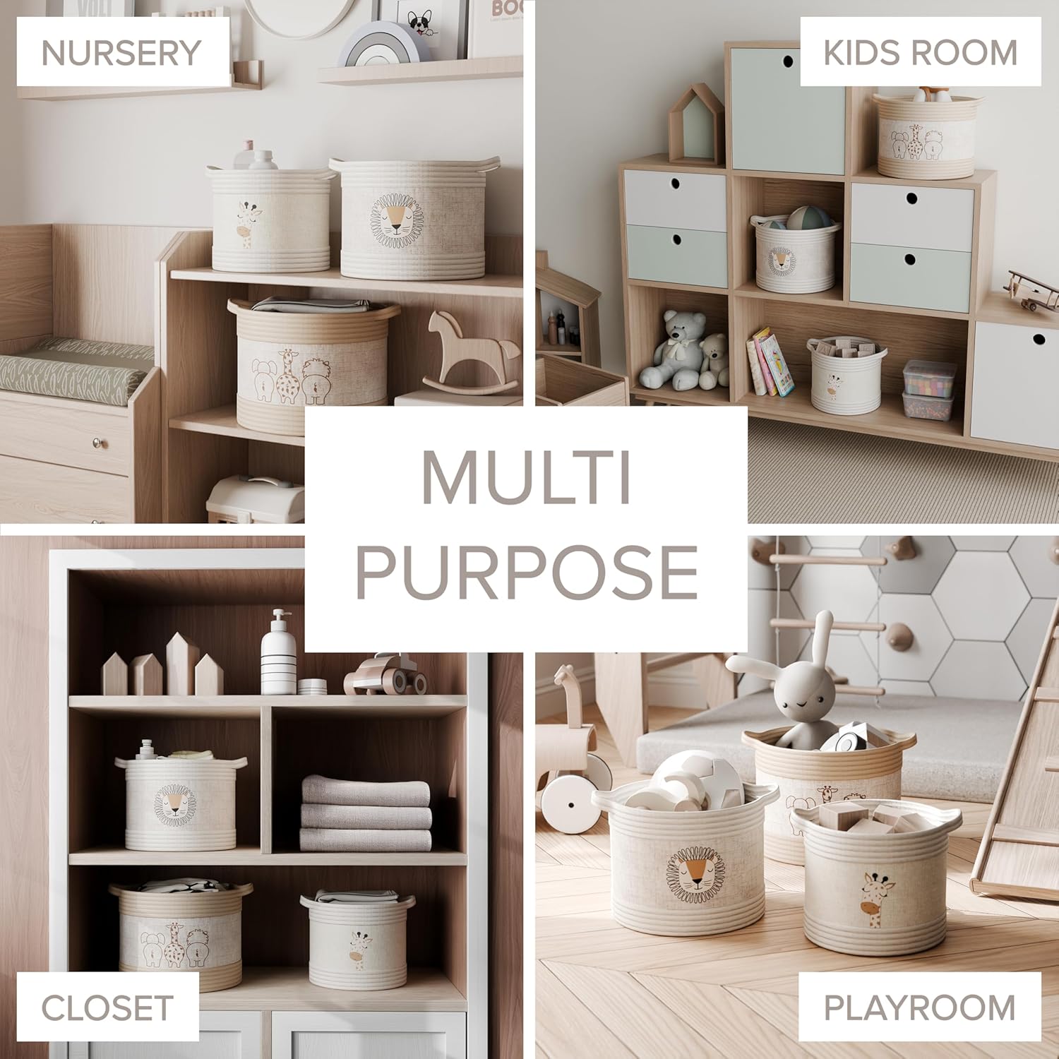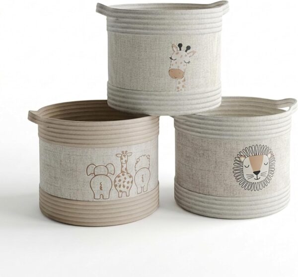 • Whimsical animal prints that make a nursery or playroom feel complete — Exotic safari animals printed on natural linen give these baskets a personality that plain storage bins simply don’t have. They work as décor as much as storage — the kind of detail that makes a nursery feel styled rather than just organized.