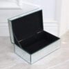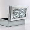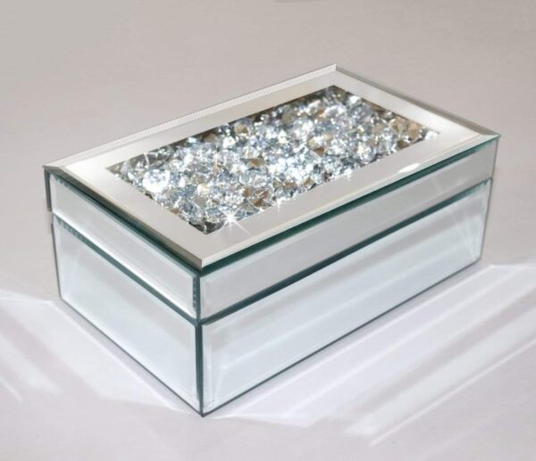 - Crushed diamond and mirror glass that catches light from every angle — The acrylic crushed diamond top and full mirror glass exterior create a surface that sparkles and reflects differently depending on where it sits in the room. It’s the kind of visual presence that makes the box as much a décor piece as a storage solution — the two functions are inseparable here.