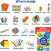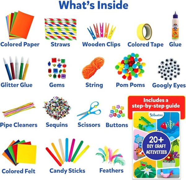 • WHAT’S INSIDE: Step-By-Step Activity Guide, Colored Paper, Pom Poms, Googly Eyes, String, Pipe Cleaners, Buttons, Colored Felt, Feathers, Glitter Glue, Colored Tape, Sequins, Gems, Glue, Straws, Child Safe Scissors, Wooden Clips and Candy Sticks.