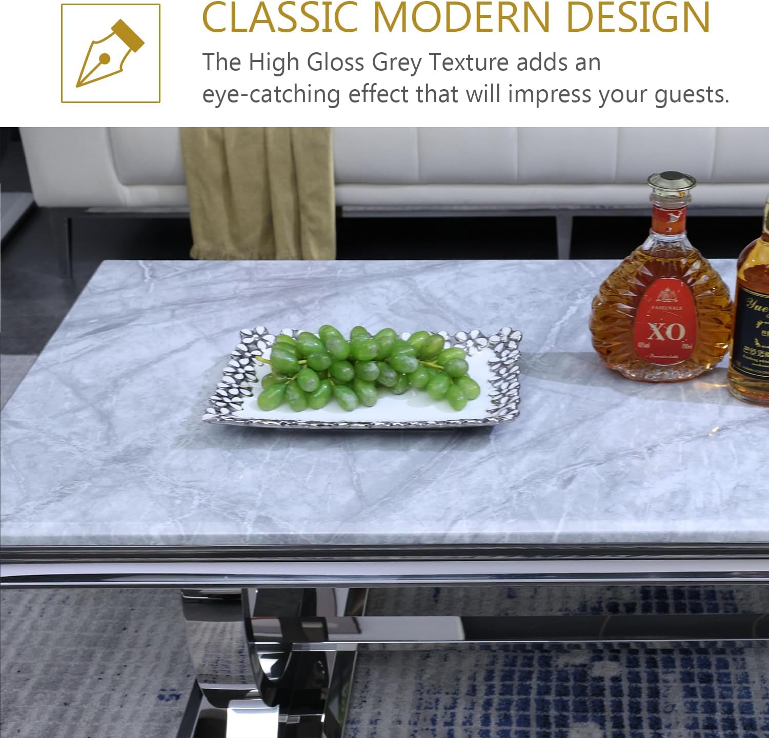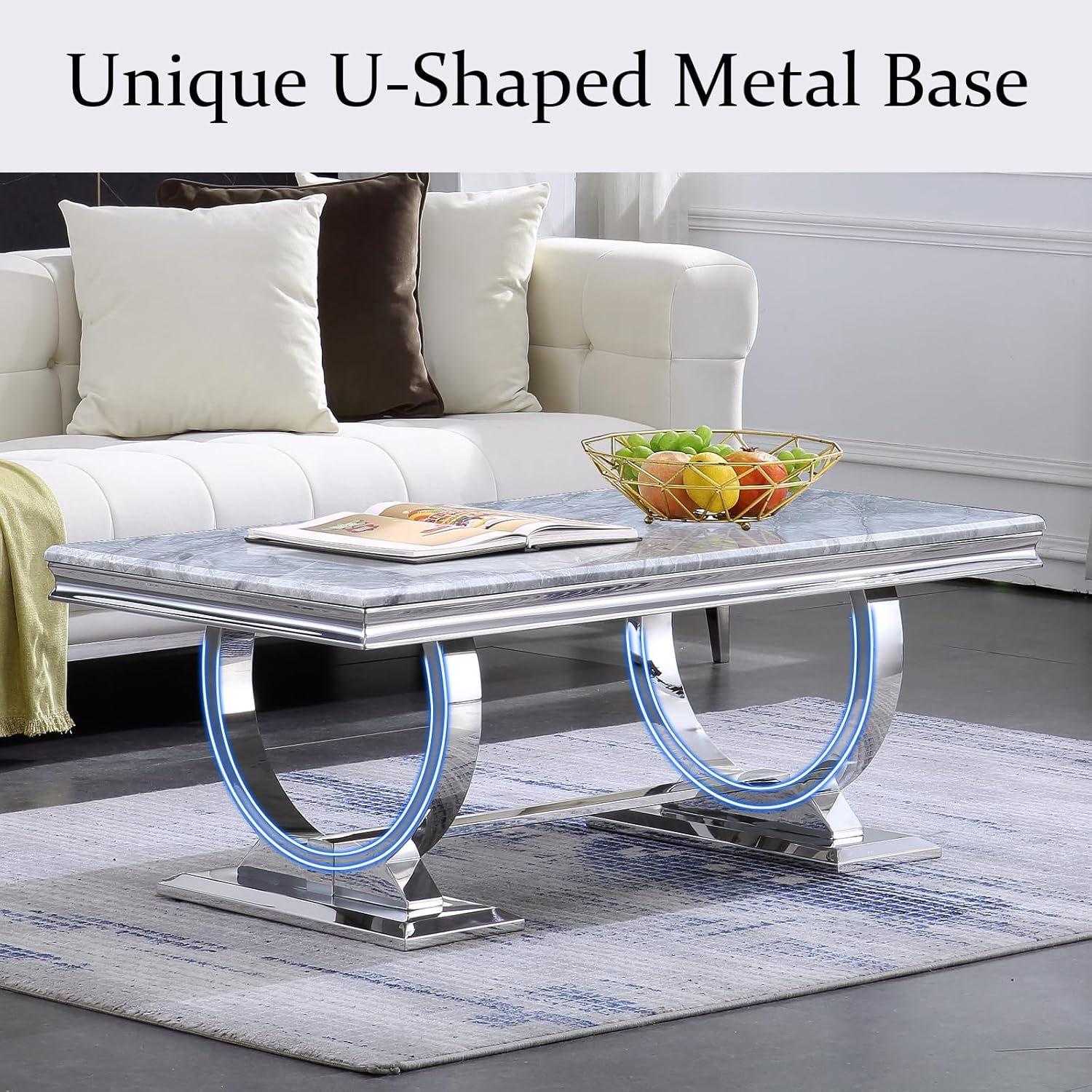 - The two‑tone grey tabletop and mirrored silver U‑shaped metal base create a modern, eye‑catching centerpiece that brings a cozy yet sophisticated feel to your living room.