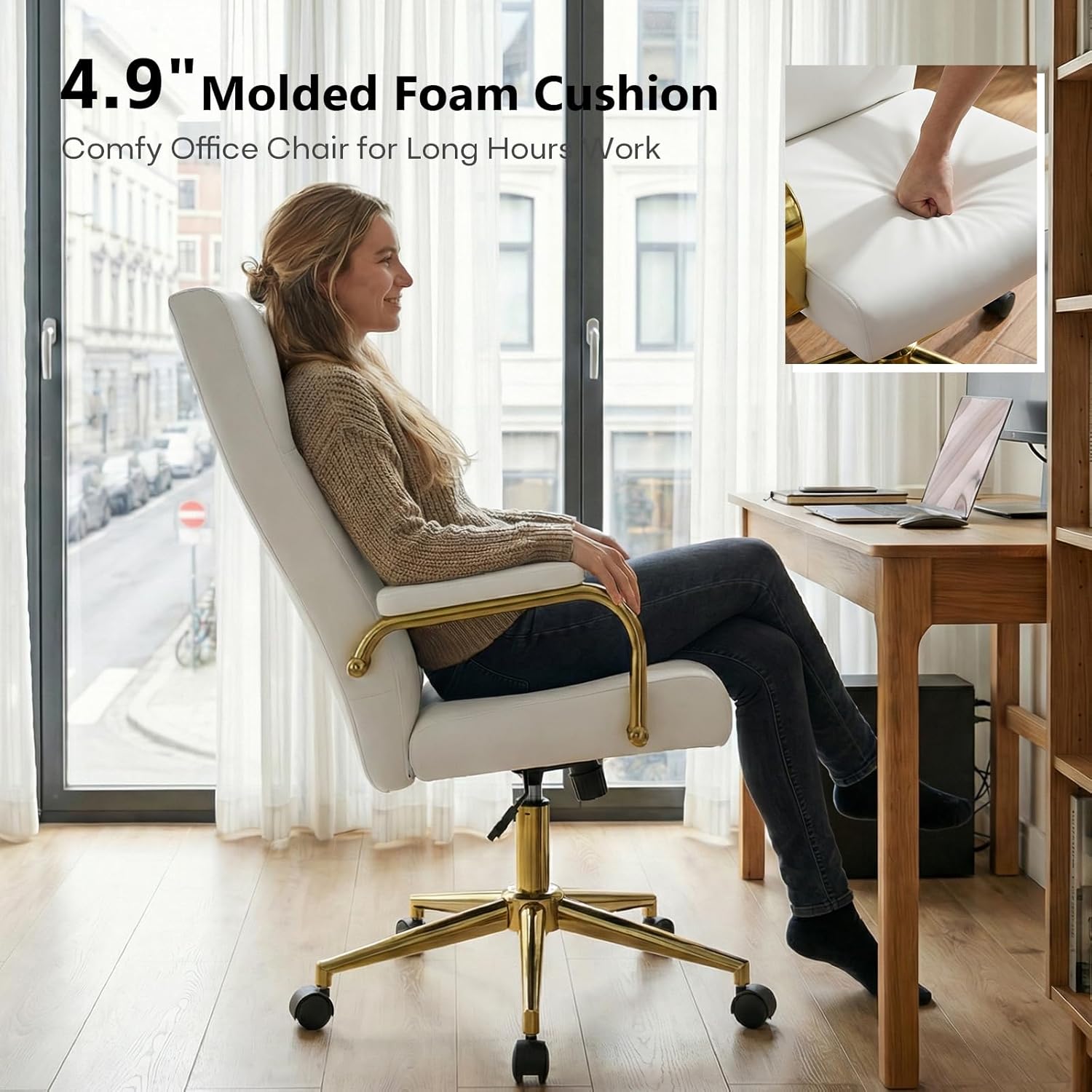 - Features a sleek white finish with gold accents, adding a modern and elegant touch to any workspace or home office.