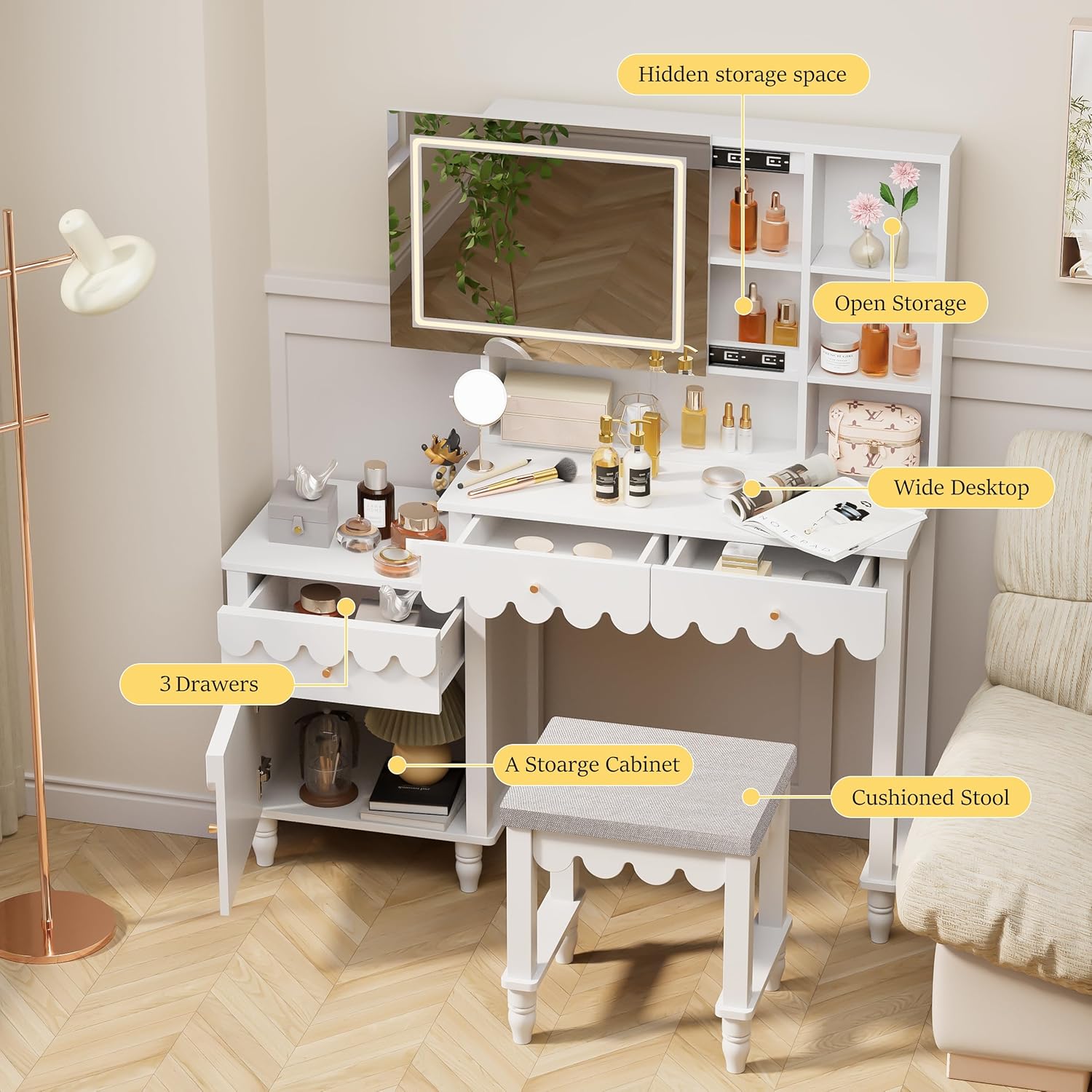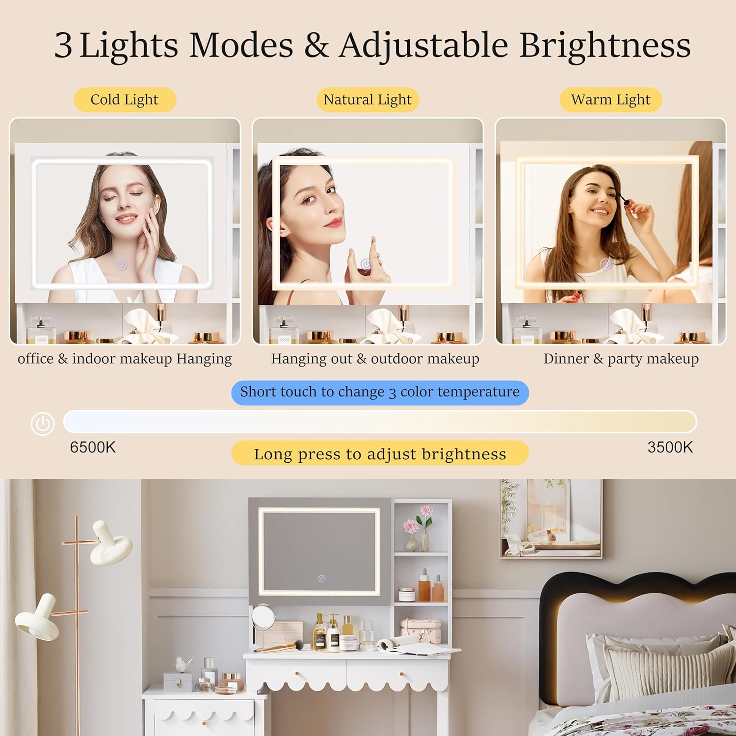 White Makeup Vanity Desk with Lighted Mirror Storage Drawers Stool