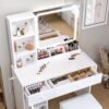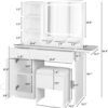 - Offers ample storage with a spacious tabletop, open shelves, drawers, and a cabinet to keep cosmetics and accessories neatly organized.