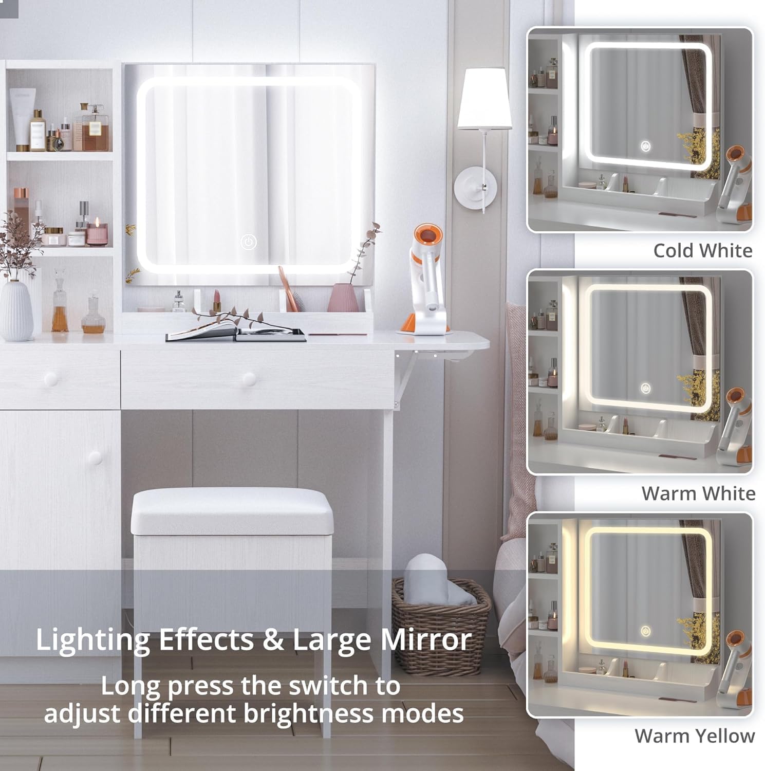 - Features a large LED lighted mirror with adjustable brightness and multiple lighting modes for different makeup needs and settings.